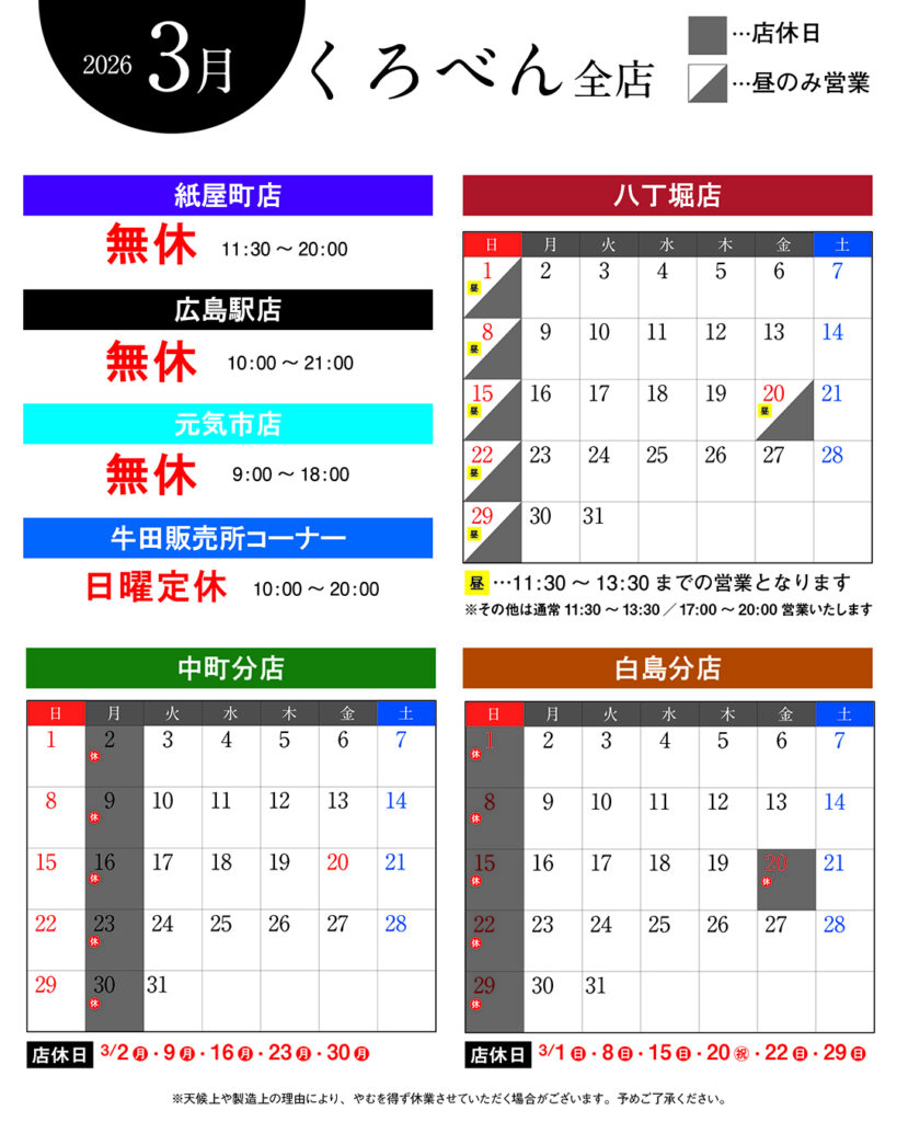 2026.2.27 3月営業日のご案内 日頃より当店をご利用いただき御礼申し上げます。3月の営業日のご案内です。 お花見や公園でのランチ、卒業・送別会などの集まりに、当店ののり弁はいかがでしょうか。冷めても美味しいこだわりの味を、ぜひ春の空の下でお楽しみください。皆様の春のひとときに彩りを添えられるよう、一つひとつ心を込めてお作りいたします。